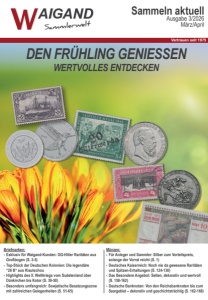 Sammeln aktuell Ausgabe 3/2026 März/April Vertrauen seit 1975 DEN FRÜHLING GENIESSEN WERTVOLLES ENTDECKEN Münzen: - Für Anleger und Sammler: Silber zum Vorteilspreis, solange der Vorrat reicht (S. 1) - Deutsches Kaiserreich: Noch nie da gewesene Raritäten und Spitzen-Erhaltungen (S. 124-130) - Das Besondere Angebot: Selten, dekorativ und wertvoll (S. 158-162) - Deutsche Banknoten: Von den Reichsbanknoten bis zum Saargebiet – dekorativ und geschichtsträchtig (S. 162-168) Briefmarken: - Exklusiv für Waigand-Kunden: GG-Hitler Raritäten aus Großbogen (S. 3-5) - Top-Stück der Deutschen Kolonien: Die legendäre “26 B“ aus Kiautschou - Highlights des II. Weltkriegs vom Sudetenland über Dünkirchen bis Kotor (S. 39-50) - Besonders umfangreich: Sowjetische Besatzungszone mit zahlreichen Gelegenheiten (S. 51-65)