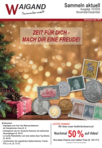 Sammeln aktuell Ausgabe 10/2025 November/Dezember Vertrauen seit 1975 Briefmarken: - Highlights zum Fest: Die Weihnachtsblocks der Sowjetischen Zone (S. 3) - Umfangreich wie nie: Deutsche Kolonien mit zahlreichen Neueingängen (S. 20-27) - La Carita-Plattenfehler und viele weitere Saar Top-Stücke (S. 28-33) - Liechtenstein mit ungezähnten Spitzenstücken, Farben, FDC u.v.m. (S. 72-73) Wir lösen unser Grafik-Sortiment auf: Nochmal 50% auf Alles! Ihre letzte Chance zum halben Preis (S. 143-171) *Nur gültig bis 31.12.25 auf unser Grafik-Angebot LETZTE CHANCE! ZEIT FÜR DICH - MACH DIR EINE FREUDE!
