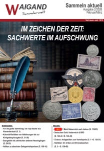 Münzen: - 1 Mark Kaiserreich nach Jahren (S. 118-23) - Deutsches Gold: Kaiserreich & BRD (S. 123-24 +S. 142-43) - Chance: Anlagesilber zum Vorteilspreis (S. 1 +S. 155-57) - Raritäten: Dt. Orden und Ehrenabzeichen (S. 3 + S. 158-60) Sammeln aktuell Ausgabe 2/2026 Februar/März Vertrauen seit 1975 IM ZEICHEN DER ZEIT: SACHWERTE IMAUFSCHWUNG NEU! Briefmarken: - Für die große Sammlung: Die Top-Stücke aus Alexanderstadt (S. 3) - Kolonial-Raritäten von Halbierungen bis zur Königsberg-Ausgabe (S. 21-28) - Saargebiet mit zahlreichen seltenen Neueingängen (S. 29-35) - Vatikan zu absoluten Gelegenheitspreisen (S. 108-10)